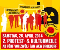 Ein Bündnis von über 30 Initiativen und Verbänden, darunter auch Parteien, ruft für den 26. April zu einer Protest- und Kulturmeile am AKW Brokdorf auf. Ab 11:30 Uhr gibt es Musik auf der Bühne, um Fünf vor Zwölf erfolgt die Begrüßung. Bis 14:00 Uhr lädt dann die Meile zum Schlendern ein mit Infoständen, Mitmach-Aktionen, einem vielfältigen Musikangebot – Kleinkünstler, Bands, Liedermacher, Trommel- und Bläsergruppen – und leckerem Essen in Bio-Qualität. Um 14:00 Uhr gibt es Redebeiträge u. a. von Brokdorf-akut, der AG Schacht Konrad, ROBIN WOOD, der IPPNW, dem Bundesverband Windenergie, Grußadressen vom BBU und Anti-AKW-Gegnern aus Polen und Tansania. Verschiedene Musikbeiträge, z. B. von Olaf Plotz mit Blaney & Heuer und der Gruppe Gutzeit schließen das bunt-kreative Programm der etwas anderen Demo-Veranstaltung ab.