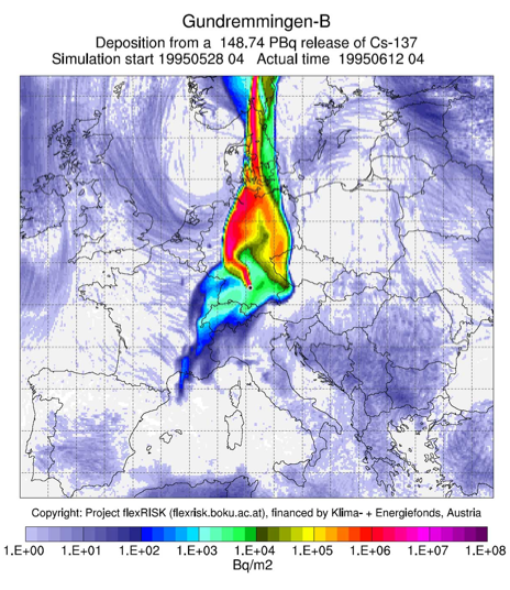 Unfall-Szenario AKW Gundremmingen-B mit meteorologischen Daten am 5. Mai 1995