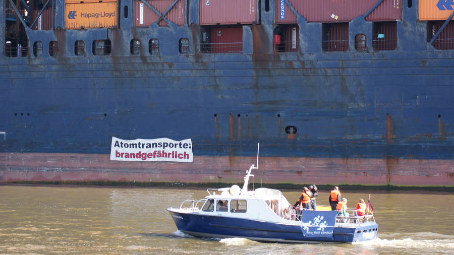 Von einer Barkasse aus wurde ein großes Transparent mit Magneten an der Schiffswand der Atlantic Cartier angebracht: „Atomtransporte brandgefährlich“ war darauf zu lesen. Die Atlantic Cartier hat heute morgen am Uni-Kai gegen 8 Uhr fest gemacht.