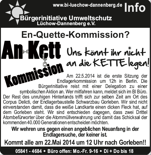 Unter dem Motto „Wir lassen uns nicht an die Kette legen“ veranstaltet die BI Lüchow-Dannenberg am Donnerstag, 22. Mai um 12.00 Uhr vor Sitzungsbeginn in Berlin ein „Mitmachtheater einer Ankett-Kommission“. Vor dem Salzstock in Gorleben beginnt um 12.00 Uhr eine Kundgebung, zu der auch die Bäuerliche Notgemeinschaft aufruft.