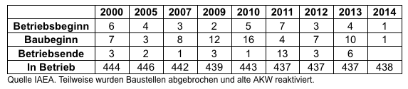 Laut Zahlen der Internationalen Atomenergieagentur (IAEA) wurde weltweit im ersten Halbjahr 2014 ein Großreaktor in China in Betrieb genommen und mit dem Bau eines Kleinreaktors in Argentinien begonnen. Offiziell sind gegenwärtig noch 438 Reaktoren mit einer Gesamtleistung von 373 Gigawatt (GW) in Betrieb. Also weniger Reaktoren als im Jahr 2000.