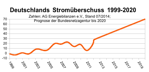 Allein im ersten Halbjahr 2014 lag der Export bei 18,3 Terawattstunden (TWh), berichtet heise.de. Im bisherigen Rekordjahres 2013 lag der Überschuss im gleichen Zeitraum noch bei 14,4 TWh. Damit ist zu erwarten, dass der Vorjahresrekord von 32,3 TWh übertroffen wird. Die Bundesnetzagentur rechnet sogar damit, dass bis zum Ende des Jahrzehnts die jährlichen Stromexportüberschüsse noch weiter auf jährlich 70 Terawattstunden ansteigen werden – trotz der weiteren Stilllegung von Atomkraftwerken. Derzeit sind vor allem die Klimakiller Braunkohlekraftwerke für den hohen Stromüberschuss verantwortlich.