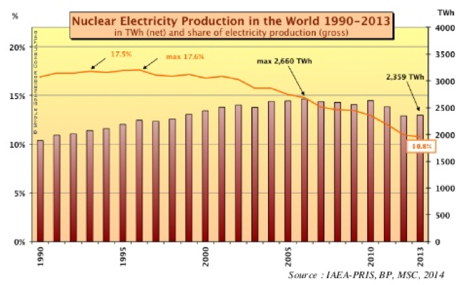 Der Anteil der Atomkraft an der gesamten Stromproduktion nimmt weltweit ab. Dies dokumentiert der World Nuclear Industry Status Report 2014, der diese Woche in Washington publiziert wurde.