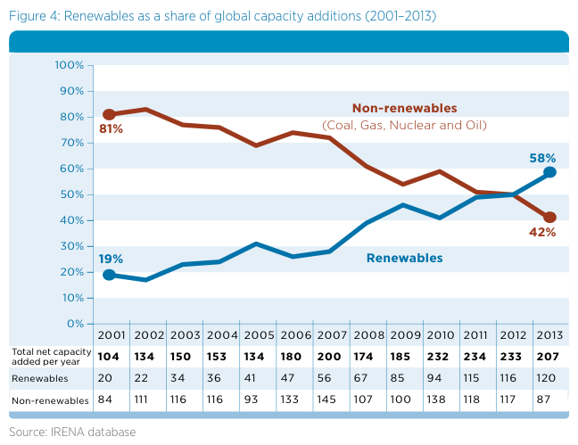 Trotz des Kohlebooms in China und Indien, zahlreichen Ländern die ein Beharren auf Atomkraft immer wieder betonen nimmt die Energiewende weltweit an Fahrt auf. Seit der Jahrtausendwende ist die jährlich installierte Leistung von Wasserkraft-, Windkraft- und Solaranlagen in hohem Tempo auf 120 Gigawatt gewachsen. Davon entfielen 40 Gigawatt auf die Wasserkraft, 38 Gigawatt auf Solaranlagen und 35,5 Gigawatt auf Windkraftanlagen. Erstmals entfiele der Großteil des Zubaus 2013 sogar auf Schwellen- und Entwicklungsländern. Die Leistung der zugebauten Kohle-, Atom- und Gaskraftwerke ging dagegen zuletzt deutlich zurück, trotz ambitionierter Zubaupläne in China, Indien und den USA. Das rasche Wachstum sei vor allem den sinkenden Kosten für erneuerbare Energien geschuldet, hält die Internationale Organisation für Erneuerbare Energien (IRENA) in ihrem Bericht „Rethinking Energy“ fest. Der Anteil erneuerbarer Energien in der Stromerzeugung ist weltweit auf 22 Prozent gewachsen.