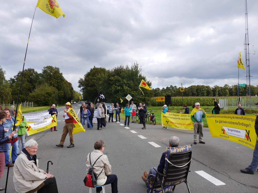 Am Sonntag (21. September 2014) haben im Rahmen einer bundesweiten Atommüllkampagne etwa 70 bis 80 AtomkraftgegnerInnen am Atommüll-Castorlager in Ahaus demonstriert. Dabei wurde die Landstraße vor dem Atommüll-Lager für rund eine Stunde symbolisch blockiert.