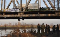 6. Oktober 2014 – Kein Castor nach Lubmin! – Unter diesem Motto protestierten am 16. Februar 2011 viele Menschen auf nahezu der gesamten Strecke gegen den Transport von Atommüll aus dem ehemaligen Kernforschungszentrum Karlsruhe nach Lubmin – auch zwischen Schkopau und Halle-Ammendorf. Dort hatten sich zwei ROBIN WOOD-Aktivisten von einer Brücke über die Saale abgeseilt. Die Weiterfahrt des Castor-Transports verzögerte sich um fast zwei Stunden.