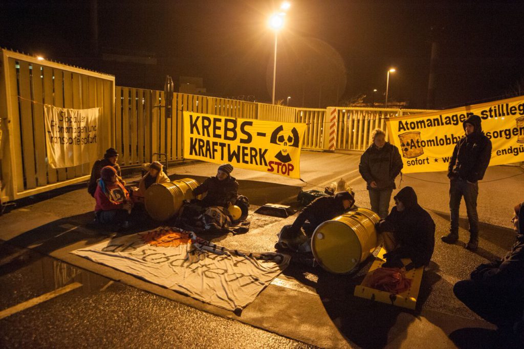 Die Tore werden mit einem Dreibein, auf dem sich ein Mensch befindet, und zwei Betonfässern, an denen Menschen angekettet sind, versperrt. „Wer von Atomausstieg spricht, darf diesen nicht irgendwann in die Zukunft verlegen. Atomanlagen sind jeden einzelnen Tag gefährlich und können jederzeit zu einem Desaster wie in Fukushima oder Tschernobyl führen. Jetzt hat sich wieder gezeigt, dass auch das AKW Brokdorf nicht kontrolliert werden kann“, sagt Aktivistin Marita.