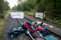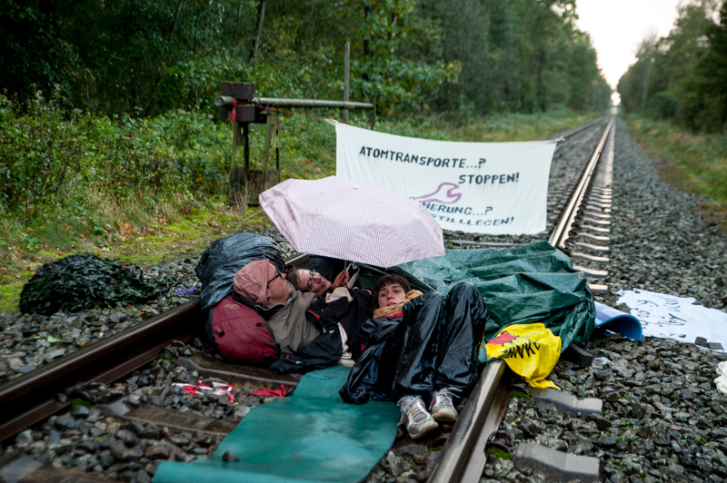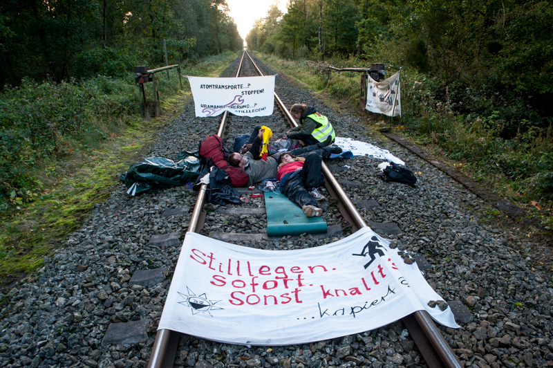 Gegen 17:45 Uhr haben sich Antiatomaktivist_innen auf der Zugstrecke Münster-Gronau an zwei Betonblöcken im Gleisbett festgekettet. Zwei Aktivist_innen haben sich vor einem mit Uranhexafluorid beladenen Güterzug, zwei dahinter, angekettet. Der Zug kann so auch über keinen anderen Weg in die Urananreicherungsanlage der Firma Urenco im westfälischen Gronau einfahren.