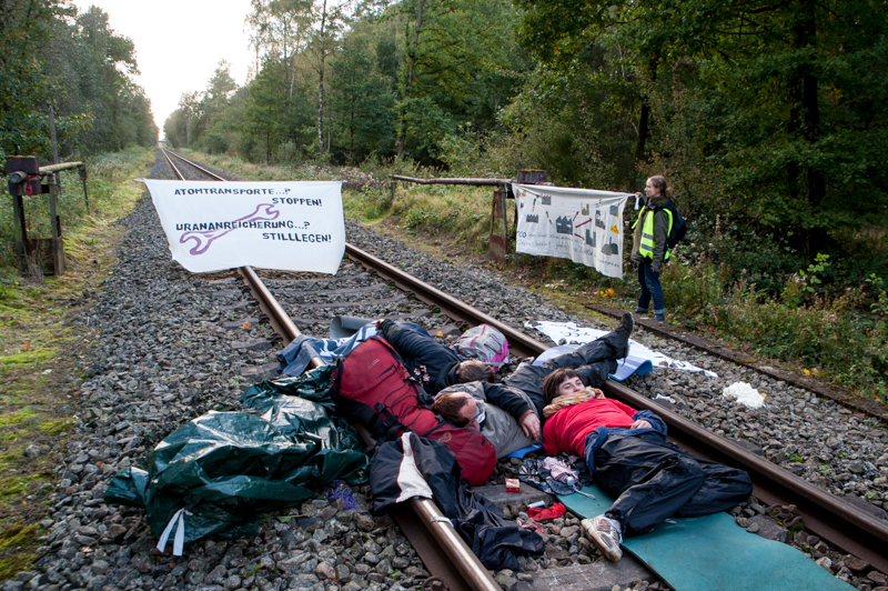 Bei der Anreicherung fällt zudem eine Menge abgereichertes Uran an. Auch dieses ist noch schwach radioaktiv und als Schwermetall giftig. Zur Zeit bleibt ein Teil in Gronau und lagert dort unter freiem Himmel, ein anderer Teil wird per Bahn nach Frankreich transportiert, um dort in Uranoxid umgewandelt zu werden. Danach soll es zurück nach Gronau, um dort langfristig gelagert zu werden. Die Urananreicherungsanlage wird so selbst auch zu einem Atommülllager. „Das ist gefährlich und nicht zu verantworten. Deswegen gehen wir entschlossen gegen diese Anlage vor“, erklärt eine der Aktivist_Innen.