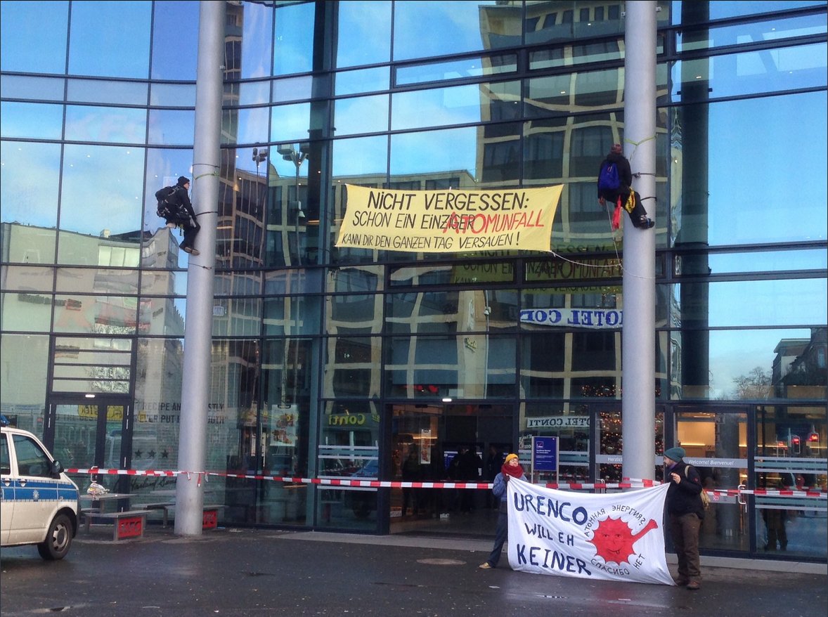 Die Nutzung von Uran ist nicht nur mit den Gefahren der Atomkraftwerke verbunden, sondern bereits beim Abbau des Urans entstehen riesige radioaktive Abraumhalten, die Menschen in den Uranabbaugebieten im Niger oder Namibia verstrahlen. „Wir wenden uns mit der heutigen Aktion auch gegen den immer noch bestehenden Kolonialismus, gegen die Ausbeutung von Ressourcen und Menschen an anderen Orten dieser Erde für unseren Strombedarf. Wir wollen nicht auf dem Rücken anderer leben, egal ob diese Uran in Afrika oder Australien oder Kohle in Kolumbien abbauen. Strom, den wir nicht verantwortungsvoll produzieren können, dürfen wir nicht verbrauchen.“ erläutert Anne Knipfer oben von den Bahnhofssäulen hinab.