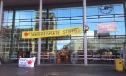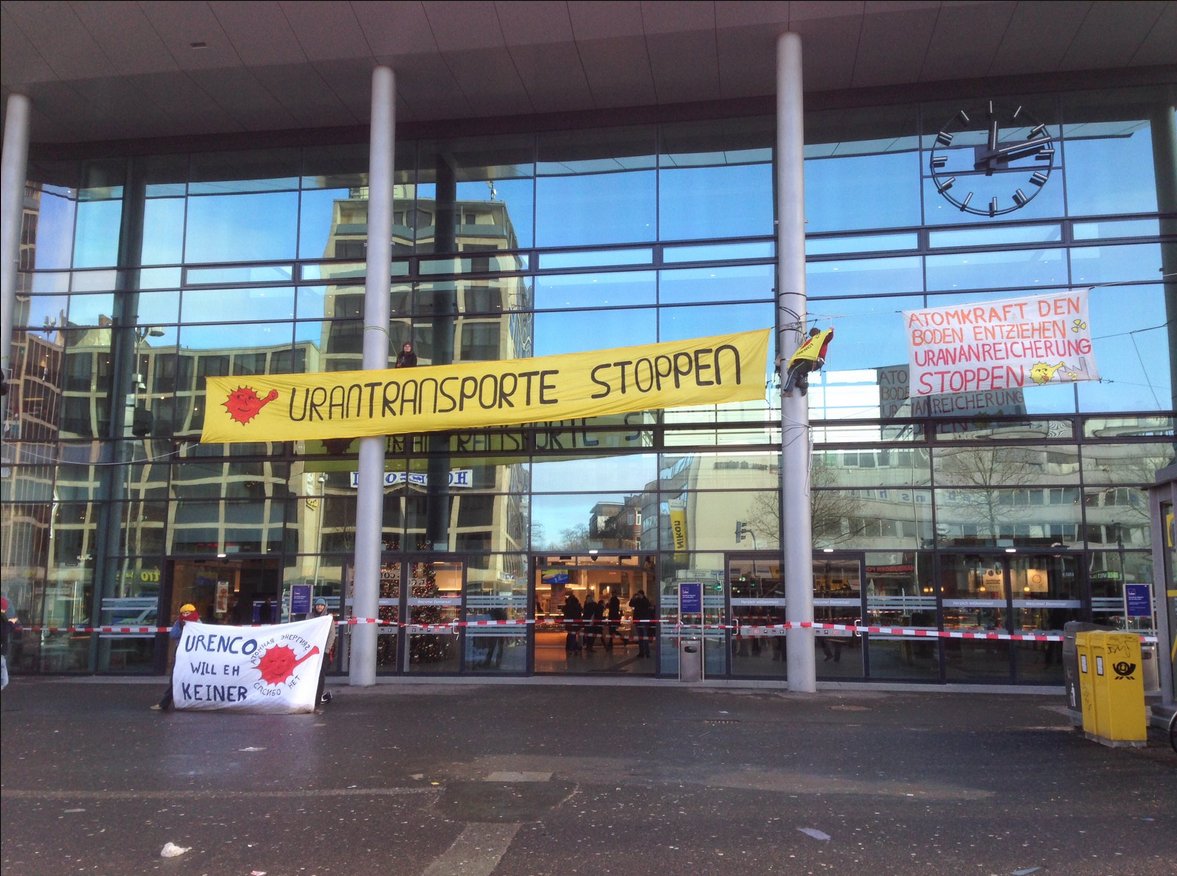 Seit 10 Uhr findet am Münsteraner Hauptbahnhof eine Kletteraktion als gemeinsame Aktion von unabhängigen Aktivist*innen und der Gruppe Sofortiger Atomausstieg (SofA) Münster statt. An den Säulen des Haupteingangs wurden Transparente wie „Urantransporte stoppen“ aufgehängt und es werden Flyer verteilt. Die Atomkraftgegner*innen wollen damit auf die Urantransporte aufmerksam machen, die monatlich auch durch den Münsteraner Hauptbahnhof fahren und die Uranfabriken in Narbonne und Gronau beliefern. Diese Transporte werden auch nach dem angeblichen „Atomausstieg“ weiter gehen.