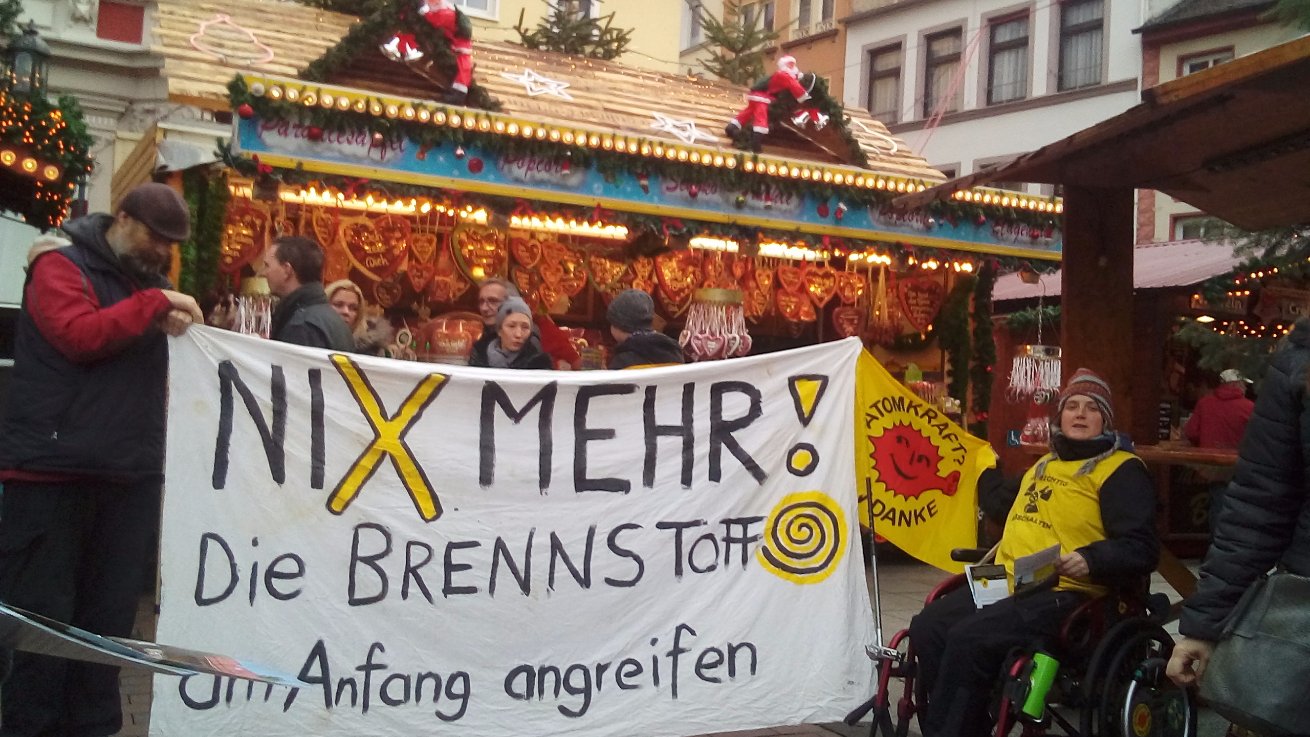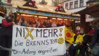 Nachdem die Aktivist*innen von der Polizei geräumt wurden zogen sie weiter auf den Weihnachtsmarkt um dort auf die durch Koblenz fahrenden Urantransporte zu informieren.